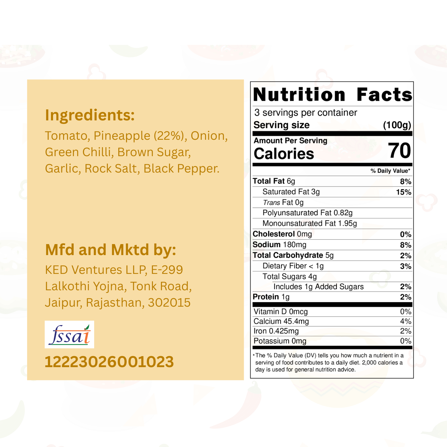 Ingredients: Tomato, Pineapple (22%), Onion, Green Chilli, Brown Sugar, Garlic, Rock Salt, Black Pepper
