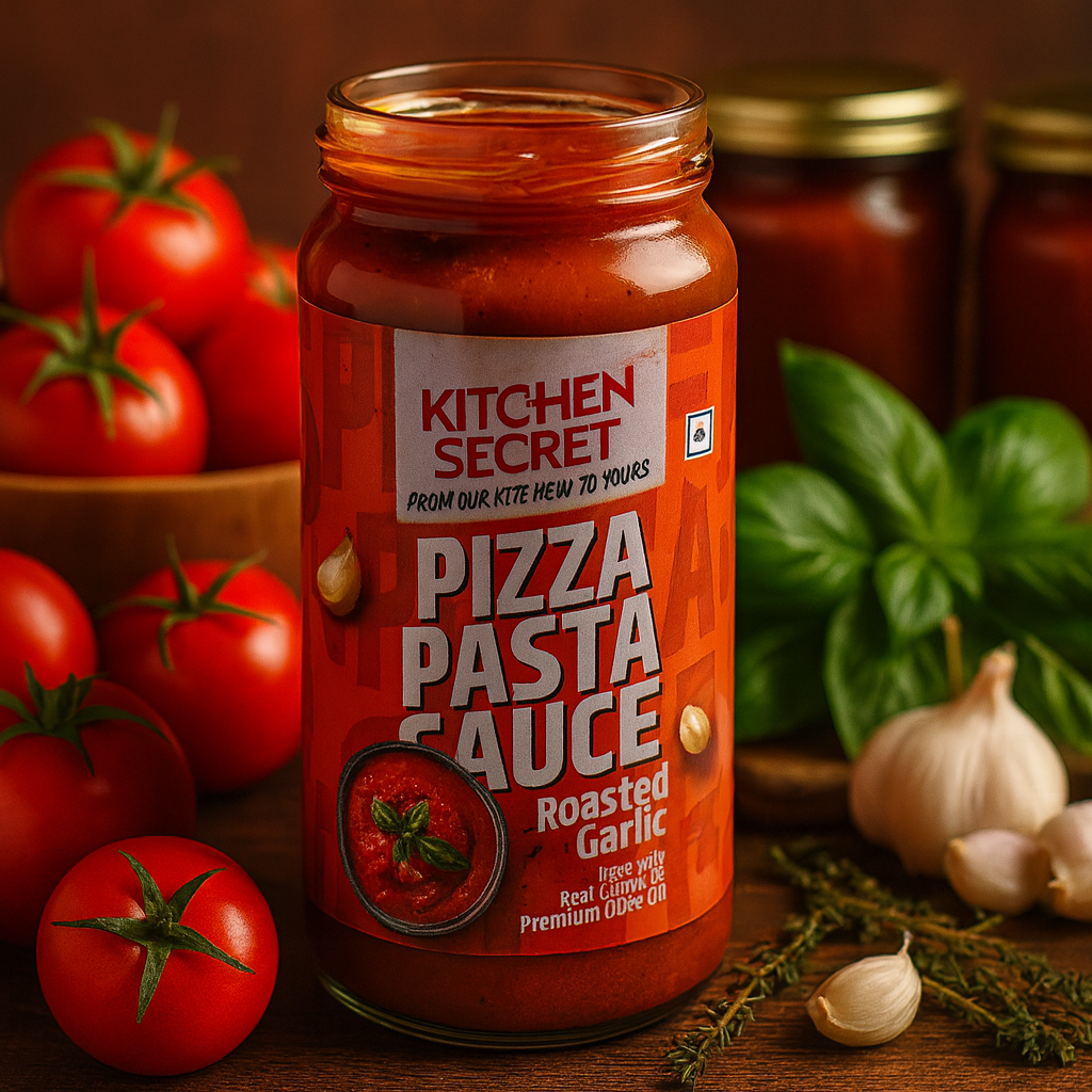 Kitchen Secret’s ready to cook Roasted Garlic Pizza Pasta Sauce blends juicy tomatoes, slow-roasted garlic, and aromatic herbs for a rich, homestyle taste. Perfectly seasoned and versatile, it transforms everyday pizzas and pastas into gourmet delights.