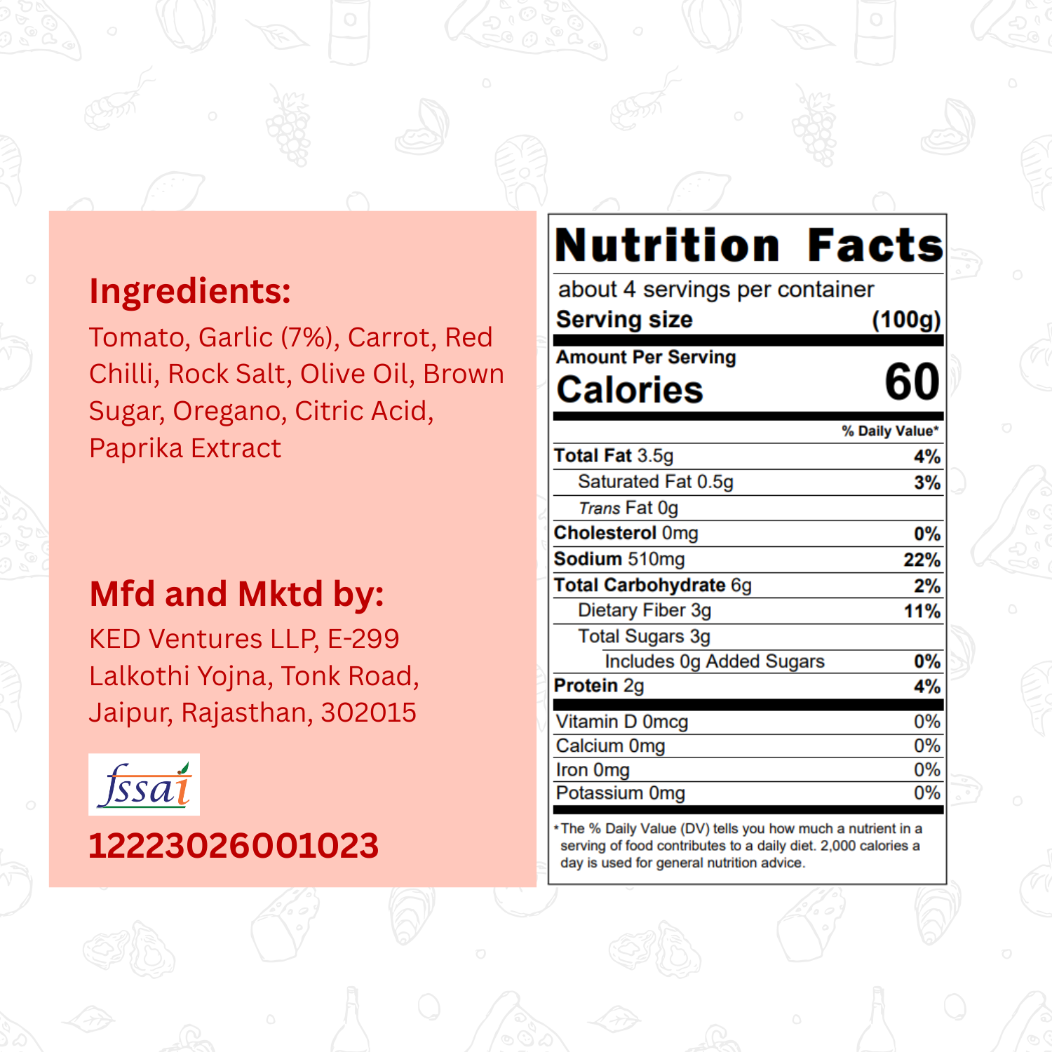 Ingredients: Tomato, Garlic (7%), Carrot, Red Chili, Rock Salt, Olive Oil, Brown Sugar, Oregano, Citric Acid, Paprika Extract